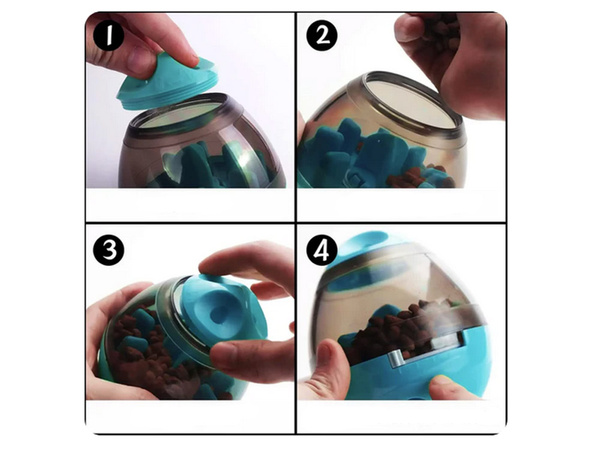 Interaktywna zabawka dla psa i kota, która sprawi radość każdemu pupilowi. W górnej części znajdują się otwory, dzięki którym ulatnia się zapach samkołyków co zachęca zwierzaka do zabawy. Do środka pojemnika można wsypać ulubioną suchą karmę. Gdy zwierzak poczuje i zobaczy w środku przysmak, próbuje się do niego dostać wprawiając w ruch zabawkę.